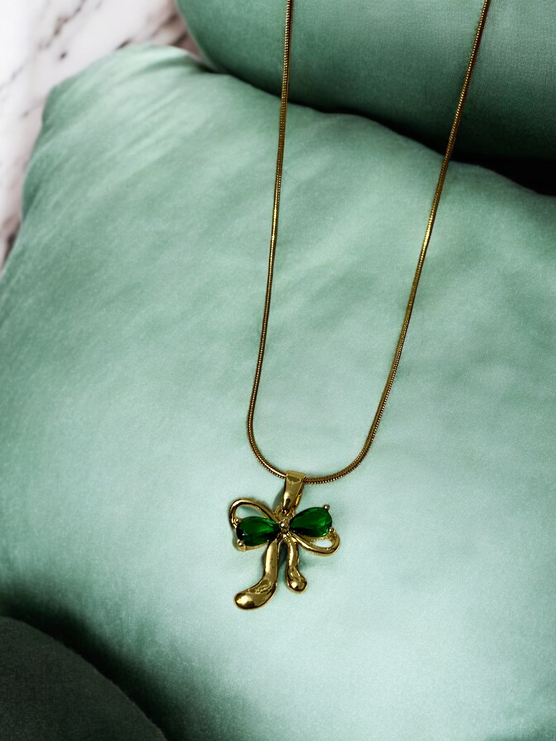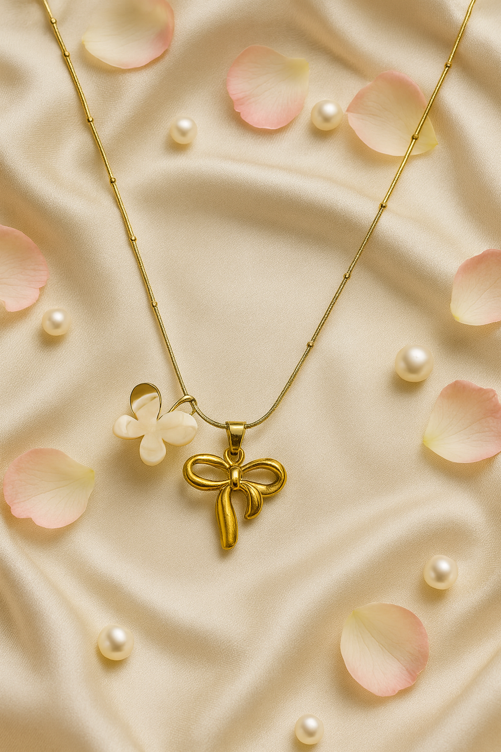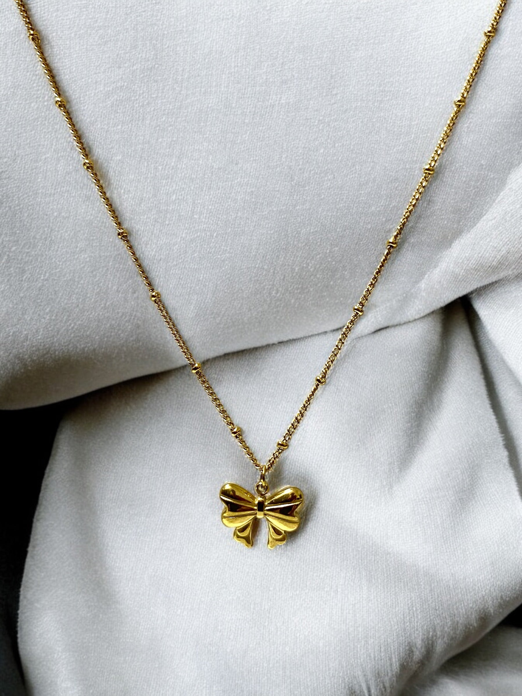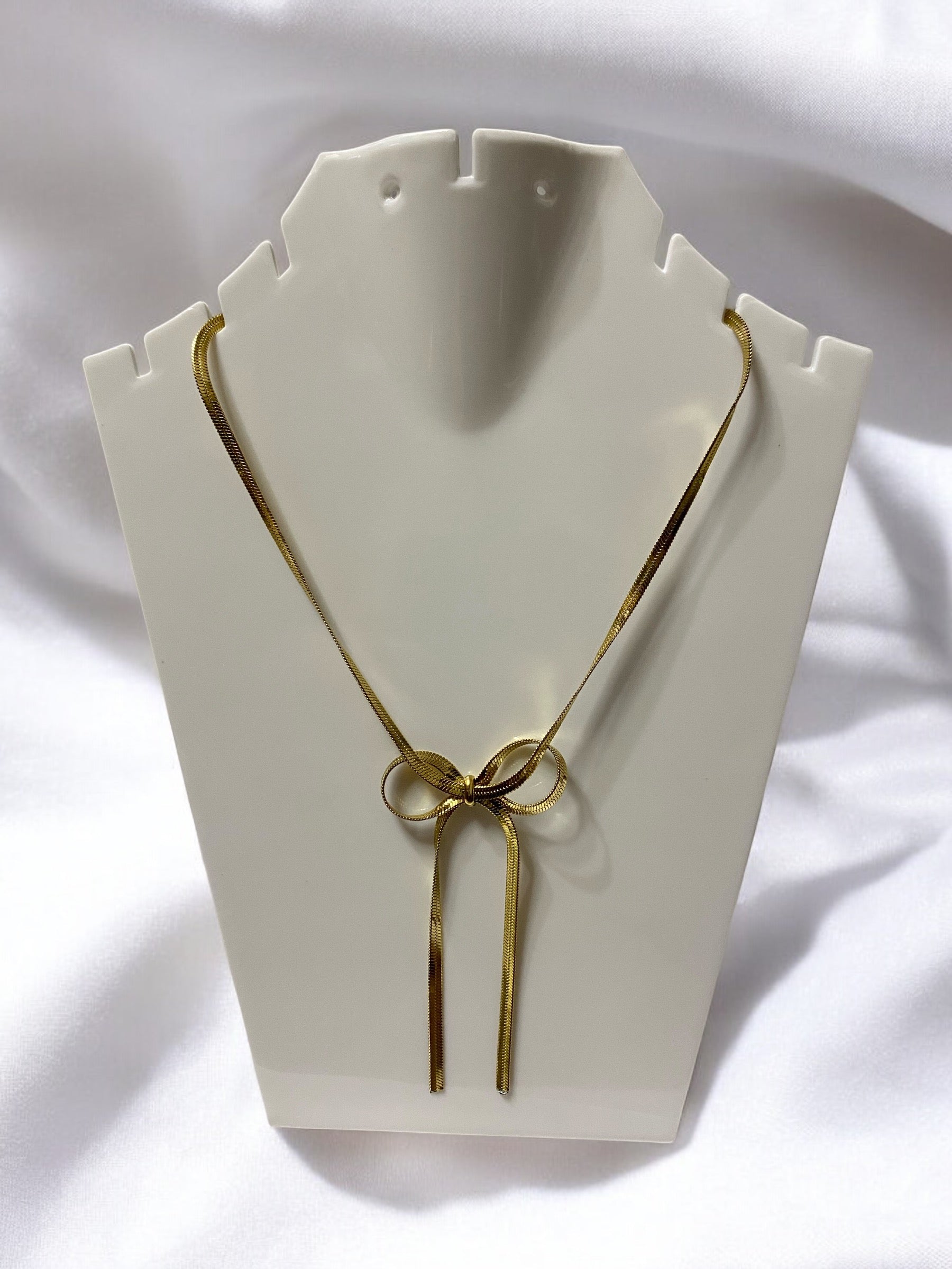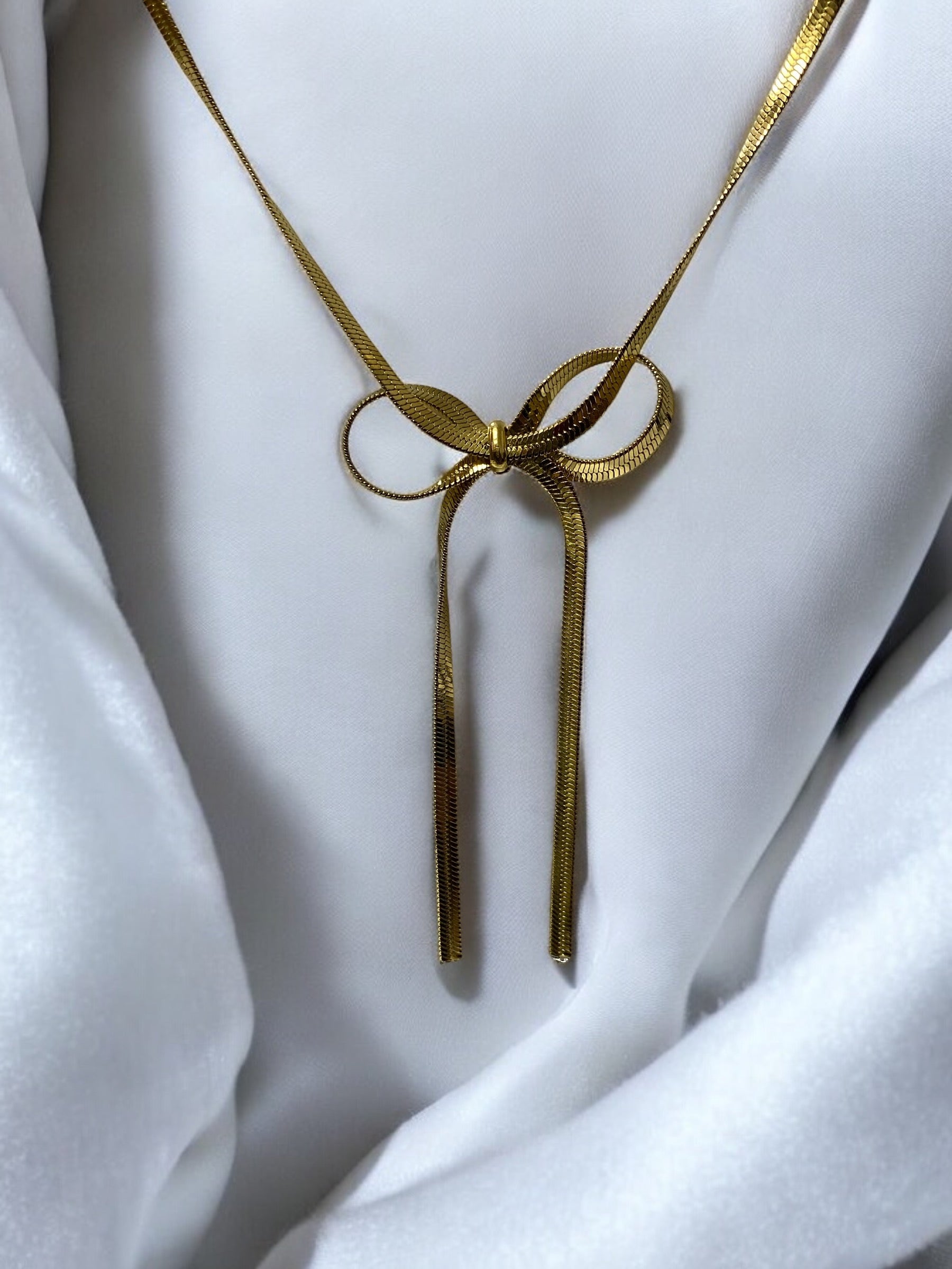 Large Bow Pendant Anti-Tarnish Gold Plated Stainless Steel Flat Snake Chain Necklace.